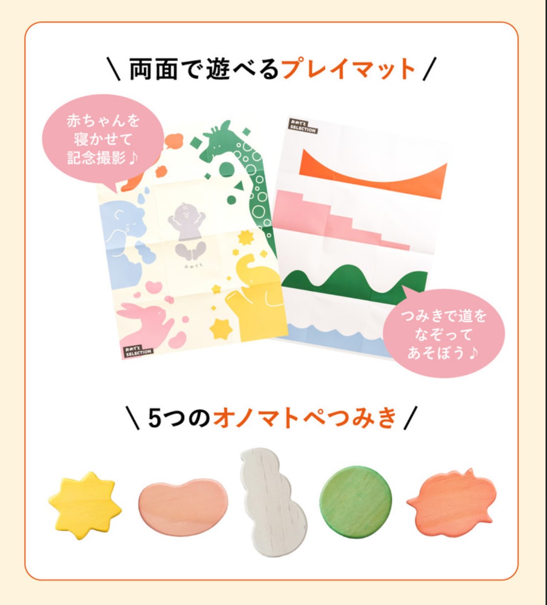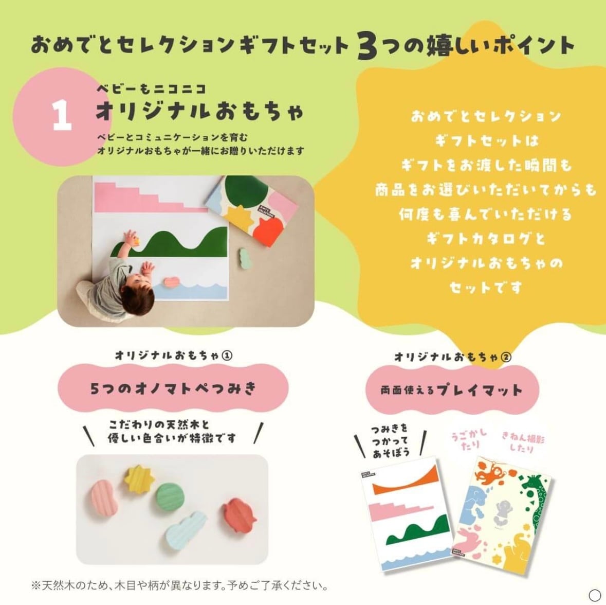 「おめでとうセレクション」は 出産のお祝いや、子供のお誕生日にぴったりな、ママ、パパ目線で本当に “ほしいもの” や “子どもが笑顔になるもの” をあつめてお届けいたします。