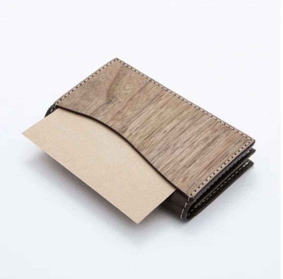 シンプルながら、4つのポケットを持つスリムで機能的なカードケースです。名刺・カード類がスマートに収納できます。内側下の2ポケットには厚手の名刺が約20枚~25枚収納できます。内側上部の1ポケット、ウッドの外ポケットはカード類の収納にお使いいただくと便利です。モダンかつスマートに。ビターなウォルナットのテイストと発色の良い手染めレザーのコンビネーションがちょっと目を引くオリジナリティあふれるデザインカードケースです。